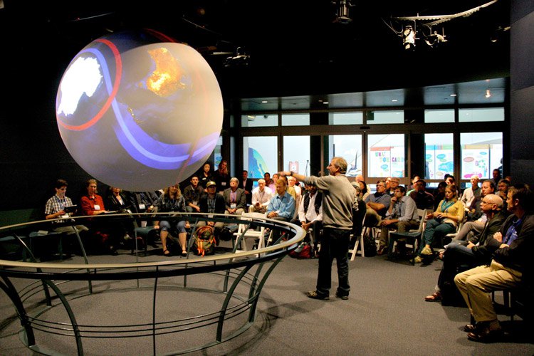 Science On a Sphere® uses computers and projectors to display visualizations of planetary data on a sphere, analogous to a giant, animated globe.